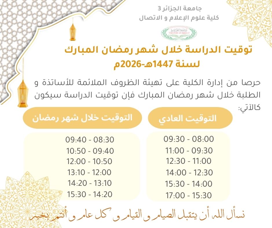 توقيت الدراسة خلال شهر رمضان المبارك لسنة 1447هـ-2026م 16 فبراير 2026 أخبار الكلـــية التعليقات على توقيت الدراسة خلال شهر رمضان المبارك لسنة 1447هـ-2026م مغلقة 13 زيارة شاركها شاركها
